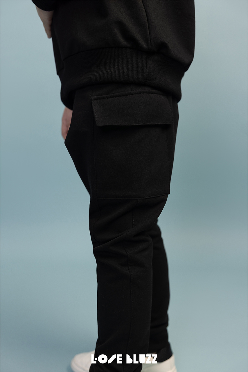 Te spodnie łączą klasyczną czerń z nowoczesnym, streetwearowym fasonem. Ich dopasowany krój sprawia, że świetnie układają się na nogach, a duże, naszywane kieszenie cargo nadają im modnego, miejskiego charakteru. Dzięki temu model jest nie tylko stylowy, ale również praktyczny – dziecko może schować w kieszeniach drobne przedmioty, takie jak chusteczki, małe zabawki czy inne skarby.