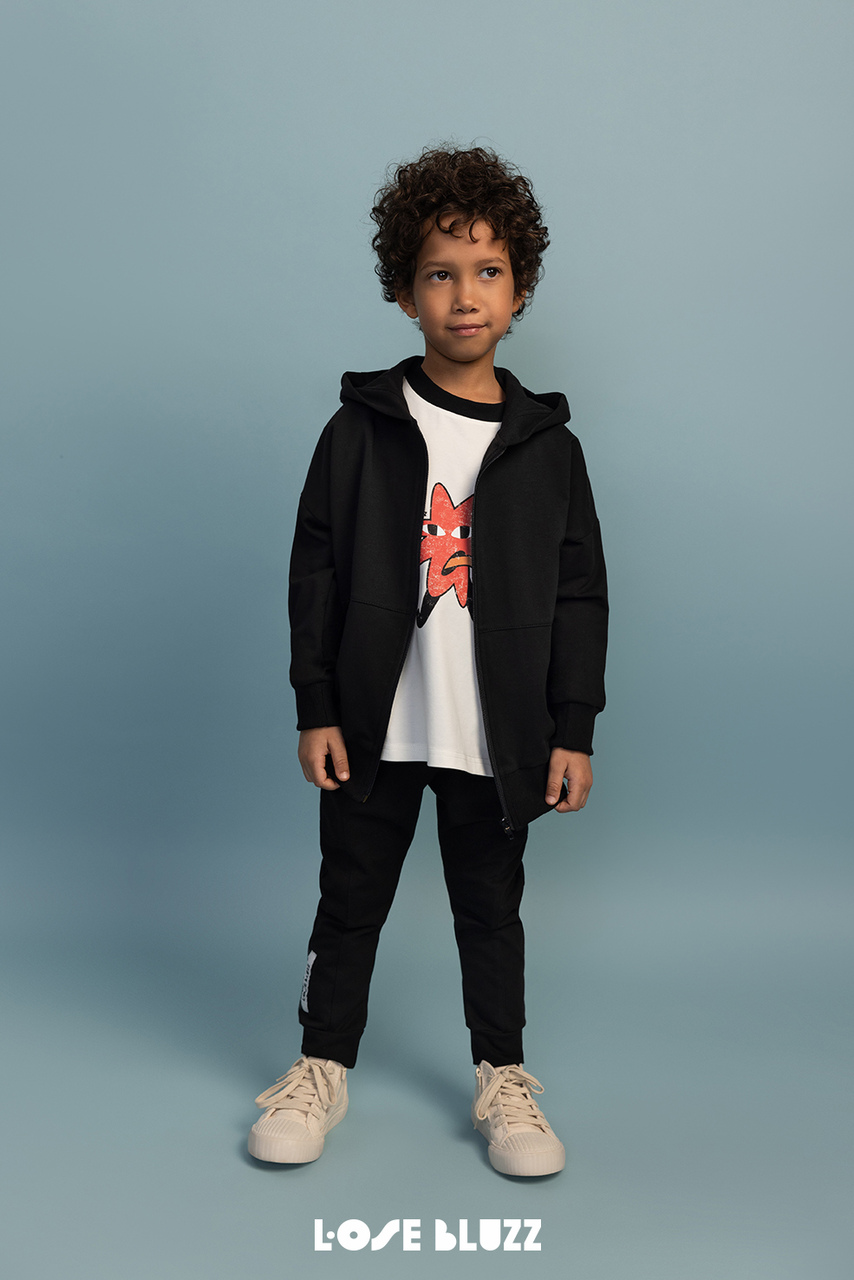Czarne spodnie dresowe dla chłopca Loose Bluzz to idealny wybór dla aktywnych dzieci, które cenią wygodę i swobodę ruchów. Wykonane z wysokiej jakości bawełny z dodatkiem elastanu, są miękkie, elastyczne i zapewniają maksymalny komfort przez cały dzień – zarówno podczas zabawy, jak i odpoczynku.